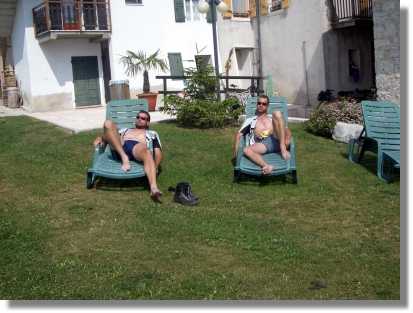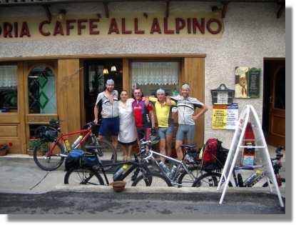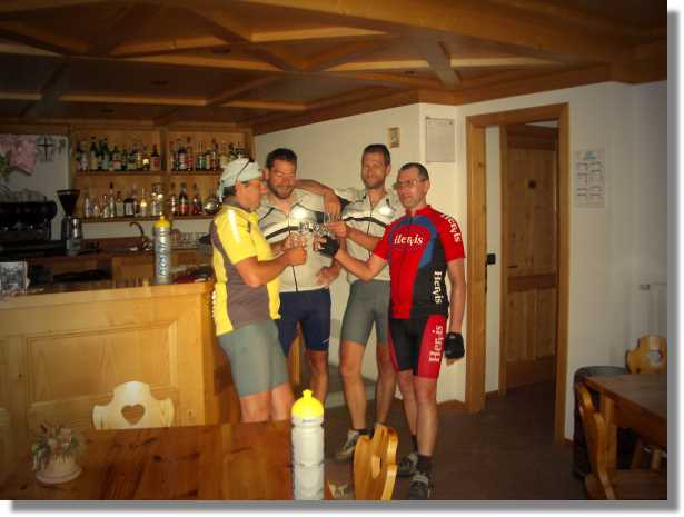 Ich darf erwähnen, dass uns Fritz wieder einmal mit seinem gigantischen Appetit begeistert. Schon die ganzen Tage ist er beim Essen unschlagbar. Als er allerdings an diesem Secondi kläglich scheitert, quittiert er das ganze nur mit einem verzweifelten ‚der Kopf lässt mich nicht’ und winkt genervt ab. (Noch am nächsten Tag falle ich vor Lachen fast vom Rad, wenn ich an diesen Spruch denke). Das Kirschkompott, das als Dolce auf den Tisch gestellt wird, ist wirklich überflüssig. Der Wirt versteht sofort die Bestellung von Martin – ‚Grappa grande’ – und stellt die ganze Flasche auf den Tisch – diesen Auftrag erledigen wir natürlich mit Bravour. Nach dieser Orgie schaffen Peter und ich nur noch den Weg ins Bett – Martin und Fritz müssen wie üblich noch eine Zappelbude aufsuchen.