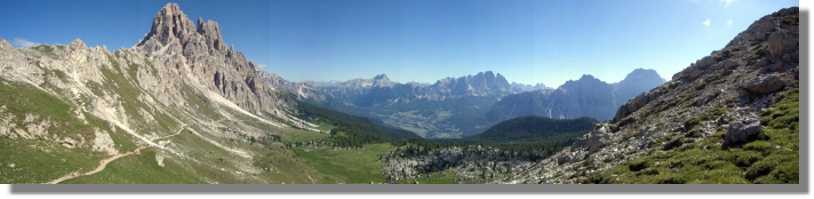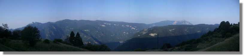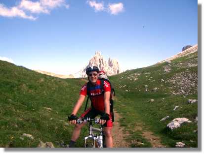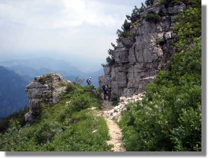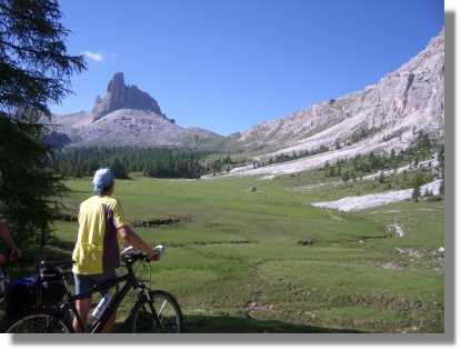 Kurz vor dem schön an einen kleinen See gelegenen Rifugio (natürlich sofort die Frage: ‚ist das schon der Gardasee?’) öffnet sich das Tal und man hat einen fantastischen Ausblick. Zu meiner Überraschung ist der breite Steig bis zum Forcella Ambrizzola (2.277) großteils fahrbar. Das grandiose Panorama ist das Highlight des Tages. Hier wünsche ich jedem Transalper Wetterglück, denn dieser Ausblick zählt sicher zu einem der genialsten, die ich kenne. Am Forcella angekommen, wird sofort der Fotoapparat für eine Panoramaaufnahme genützt. Der Steig Richtung Rifugio Citta di Fiume (1.918) führt zunächst noch weiter bergauf und kann auch teilweise gefahren werden. Nach einiger Zeit geht es bergab – allerdings muß man anfangs noch sehr viel schieben, weil die Strecke sehr schwierig ist. Nach einer verfallenen Alm wird der Weg aber immer fahrbarer.