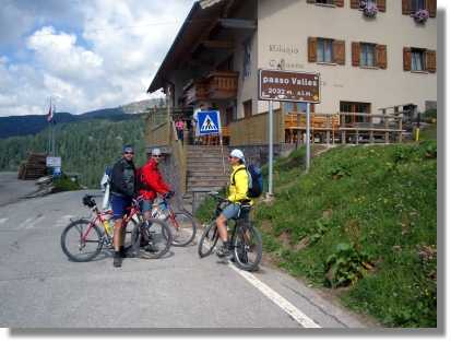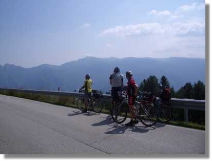 Nach ausgezeichneter und ausgiebiger Rast (Dank an Mama fürs Sponsoring) rollen wir der Strasse erst entlang des Sees und dann hinunter bis nach Cencenighe (770). Hier geht es rechts auf der Strasse Richtung Falcade (1.150). Kurz vor dem Tunnel biegen wir links auf den Radweg ab. Dieser ist sehr gut beschildert und ist daher nicht zu verfehlen. Bei Teilstücken wurde allerdings der Winkelmesser wieder einmal vergessen und es geht ganz schön zur Sache. Die zwei Kinder einer Familie, an der wir vorbei fahren, sehen wohl deshalb so grimmig aus. Falcade ist ein großer Skiort mit mehreren Hotels und zieht sich ziemlich in die Länge. Zum Glück habe ich den Standort der Unterkunft (Prospekt im Internet) recht genau im Kopf und finde auf Anhieb unser Hotel. (Il Dollaro 0437507290 - http://www.hotelildollaro.it).