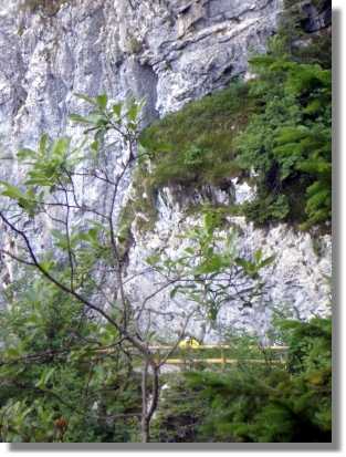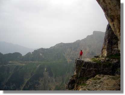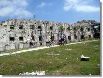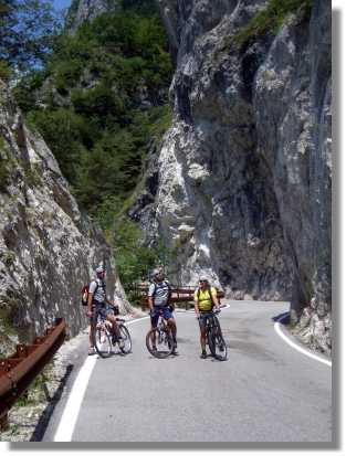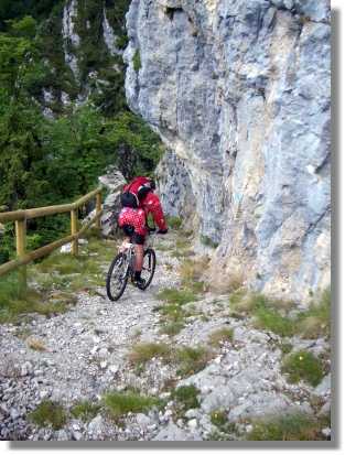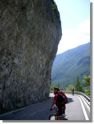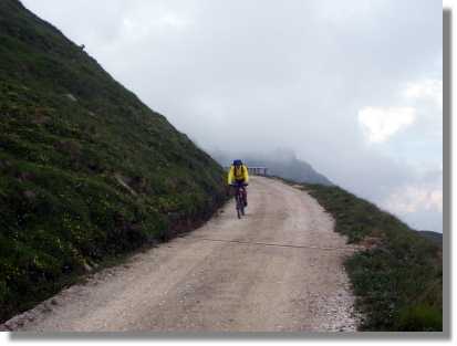 In der Nacht hat es geregnet und auch am Morgen sieht das Wetter nicht so berauschend aus. Trotzdem fahren wir über die in angenehmer Steigung angelegte Strasse zum Colle Xomo (1.058). Wenn man hier links fährt, kann man den Pasubio auslassen und spart einiges an Höhenmeter, wir fahren aber rechts steiler, aber noch asphaltiert, bis zum Parkplatz beim Einstieg zur ‚Strada delle 52 Galerie’. Dieser über 800 Höhenmeter in den Fels gehauene Steig wurde angelegt, weil der eigentliche Versorgungsweg unter österreichischen Beschuss geraten war. Diese Strada sollte man unbedingt einmal erkunden, zumindest einige der ersten Tunnels von oben oder unten. Ein Tunnel führt sogar in einer Wendel nach oben - gewaltig. Für Mountainbiker ist dieser Weg seit 1994 leider strengstens verboten. Wir nehmen also den alten Versorgungsweg und haben wieder groben Schotter unter den Stollen. Durch die relativ angenehme Steigung ist der Weg jedoch gut fahrbar. Die Landschaft wird immer fantastischer. Auch dieser Weg ist unglaublich in den Felsen gehauen und bietet einige gewaltige Aussichten.