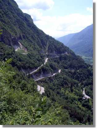 Nach der Rast fahren wir erst noch kurz bergauf und dann über die absolut genial angelegte Straße hinunter bis Grigno (250). Die Aussichten und die teilweise unglaublich in den Fels gebaute Straße sind das zweite Highlight der heutigen Etappe.