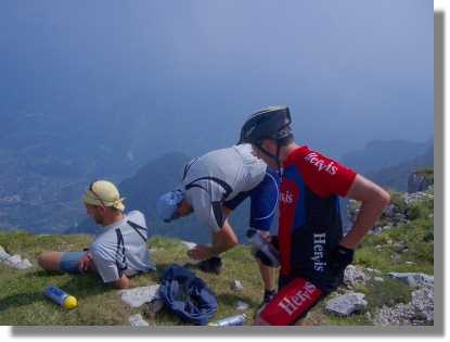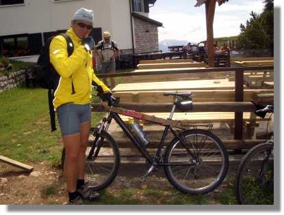 Auch hier ist das Frühstück ausreichend und wir starten gestärkt von Sdruzzinà, (160) hinüber nach Avio, um den Anstieg zum Altissimo in Angriff zu nehmen. Das Wetter ist wieder besser und zuerst läuft alles wunderbar. Die Strasse ist in angenehmer Steigung angelegt und die Aussichten sind toll. Aber schon nach ca. einer Stunde Fahrzeit habe ich das Gefühl einen Hungerast zu bekommen und schalte einen Gang zurück. Bei der Abzweigung (1.030) nach links zum Monte Baldo (rechts kommt man über San Sebastino ebenso hinauf), werfe ich einen Müsliriegel ein – welch Schmach. Aber irgendwie nützt das heute gar nichts und ich probiere es mit zwei weiteren Riegeln - Igitt. Ich fahre also mehr schlecht als recht hinter den Jungs nach, als sich plötzlich irgendwie die Geometrie des Rades seltsam anfühlt. Da macht es auch schon ‚Knack’ und der Rahmen bricht am Oberrohr nahe der Sattelstütze ab. Hand hoch ‚technischer Halt’ gerufen und schon eilen meine Brüder herbei. Zweifelnde Blicke auf die Bruchstelle. Guter Ra(d)t ist teuer. Wir haben einen Leatherman und ein paar Kabelbinder mit und beschließen, geeignete Äste zu suchen, um den Rahmen irgendwie zu stützen. Kurz darauf werden wir auch fündig, zwei ideale Bretter und ein steifer Draht liegen wie zufällig hinter einer Hütte. Die Jungs machen sich natürlich sofort einen Spaß aus der Sache und schienen das Rad professionell. Jetzt bin ich derjenige, der den Hohn und Spott einheimst. (Bis zu diesen Punkt hatte ich keinen einzigen Defekt).