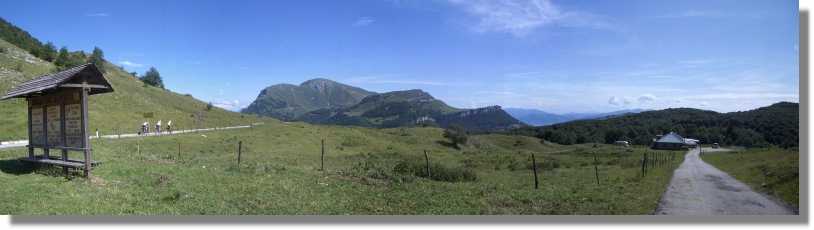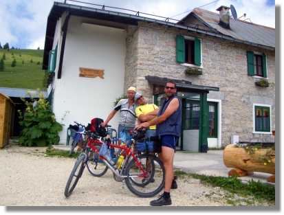 Von Grigno, einem verschlafenen Nest im Val Sugana rollen wir hinüber nach Selva (267). Hier startet der Weg zur Hochebene – dieser wird im Augenblick gerade gesichert und asphaltiert. Die Sicherungsarbeiten sind bereits abgeschlossen und ganz oben treffen wir auf die Arbeiter, die bereits die obersten 3 km asphaltiert haben. Die Arbeiten werden aber sicher noch den ganzen Juli andauern (in Italien dauert’s oft noch länger). Die Auffahrt ist aber kein Problem (keine Sperre oder ähnliches - es kommen uns auch nur zwei LKW’s entgegen). Es ist schade dass diese Strecke für den Verkehr freigegeben wird. Vor allem der Sinn ist mir schleierhaft - da die Fahrbahnbreite größtenteils nur einspurig angelegt ist, wird hier aber sicher nicht der Mörderverkehr Einzug halten. Auch wenn der Weg einmal freigegeben sein wird, ist diese Auffahrt wärmstens zu empfehlen (heute sprichwörtlich 35 Grad). Teilweise unglaublich in den Fels gebaut, führt er in vielen Serpentinen auf die Hochebene. Wasser oder Rastmöglichkeiten gibt es auf diesem Abschnitt nicht - also ordentlich Wasser bunkern und spätestens in Grigno Futter fassen. Die Auffahrt ist kräftezehrend und wir sind nicht unglücklich, als wir auf der Hochebene ankommen. Hier fahren wir immer der Asphaltstraße entlang bis zum Rifugio Barricatta (1.351). Dieses wird gerade vollkommen renoviert und wahrscheinlich aus Denkmalschutz steht nur noch die Fassade. Wir fahren deshalb einen kleinen Umweg übers Albergo Marcesina (sieht unmotiviert aus) und dann noch ein Stück bergab bis zum Rifugio Alpino Marcesina. +390424/490209.