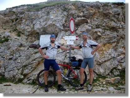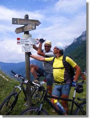 Danach fahren wir das Stück zurück und hinüber zum Passo Coe (1.610). Hier kehren wir zur verdienten Rast ein. Das Essen ist ausgezeichnet und der abschließende Grappa aufs Haus ist natürlich hervorzuheben. Nach gemütlicher und ausgiebiger Rast geht die Fahrt weiter zum Monte Maggio (1.853). Der Weg ist zuerst gut befahrbar, dann aber mit sehr groben Schotter ausgestattet und nur aufgrund der humanen Steigung fahrbar. Wir sind noch halbwegs motiviert und schaffen die Auffahrt bis zum Kreuz am Monte. Die Aussicht ist gewaltig und der Fotoapparat wird wieder bemüht. Der nun folgende Trail ist sehr ausgesetzt und aufgrund unserer mangelhaften Trailkünste schieben wir einiges. Aber die Blicke, die dieser Weg bietet, wiegt das Schieben mehr als auf – geniales Highlight, unbedingt probieren.
