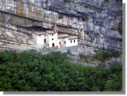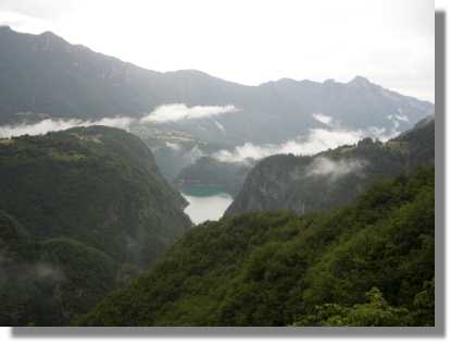 Der Regen lässt wieder nach und wir beeilen uns, hinunter zum Passo Pian delle Fugazze (1.162) zu kommen. Auch diese Seite des Pasubios hat einen beeindruckend gebauten Weg. Leider verstellt und das heutige Wetter gehörig die Aussichten. Da wir bei der Abfahrt wegen des feuchten Untergrunds langsamer und vorsichtig zur Sache gehen, erscheint mir diese als endlos. Leider beginnt es wieder leicht zu nieseln und ich bin froh, als wir zum Pass gelangen. Wir beschließen im Gasthaus, am Pass Mittag zu essen. Mit einem Liter Wein beschwören wir unser sprichwörtliches Wetterglück, leider nützt das heute nichts. Den ganzen Nachmittag begleitet uns ein lästiges leichtes Nieseln. Die Überquerung des Passo Buole (1.450) ist damit leider gestorben (möchte ich aber unbedingt einmal nachholen). Wir beschließen, den Passo Buole über Rovereto zu umfahren. Die Strasse nach Rovereto hat zwar einige lästige Gegenanstiege, führt aber großteils bergab.