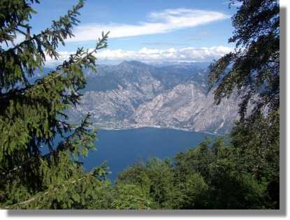 Das ganze funktioniert wirklich und ich kann wieder weiterfahren. Kurz darauf gibt es in einer Senke beim Rifugio Navene den ersten genialen Blick zum Lago. Wir fahren hinauf bis zum Rifugio Graziani (1.650) und trinken ein Bierchen. Martin tauft mein Rad sofort um und beschriftet es mit ‚Woody’. (Hohn – Gelächter – eh schon wissen).