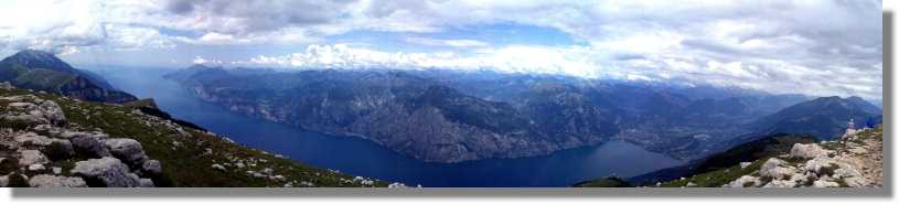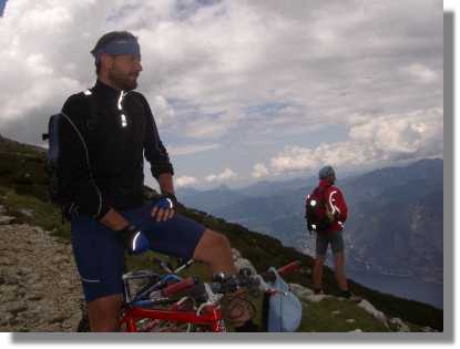 Den Altissimo bin ich ab der Rifugio Graziani schon öfters gefahren, deshalb beschreibe ich auch diesen Streckenabschnitt. Der Weg ab dem Rifugio ist relativ steil und zum Teil grob geschottert. Je nach letztem Zeitpunkt des ‚Ausputzen’ und nach Kondition ist er komplett fahrbar. Peter schafft dieses Kunststück und fährt fast die ganze Strecke bis zur Hütte am Monte Altissimo (2.070) - Bravo. Ich habe den Altissimo als würdigen Abschluss einer Transalp zum Gardasee eingeplant und neben dem Tremalzzo ist dies sicherlich auch eine der imposantesten Varianten. Das Panorama hier oben und die Ausblicke auf den See sind fantastisch – leider heute wieder durch die üblichen Quellwolken getrübt.