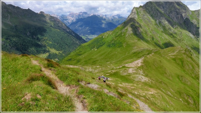 Nun können wir unsere Übungen vom Tag richtig perfektionieren. Ab jetzt wird’s nämlich richtig tragelastig. Zwei Varianten kann man Richtung Rifugio Calvi wählen. Rechts geht’s direkt zum Hochalpljoch, wir nehmen die linke, beschilderte zur Calvi Hütte. Die paar Meter die ich hinauf fahrend bewältige sind nicht der Rede wert. Es ist wieder eine mehr oder weniger lästige Schiebe-Trage Mischung zum Bladner Joch.