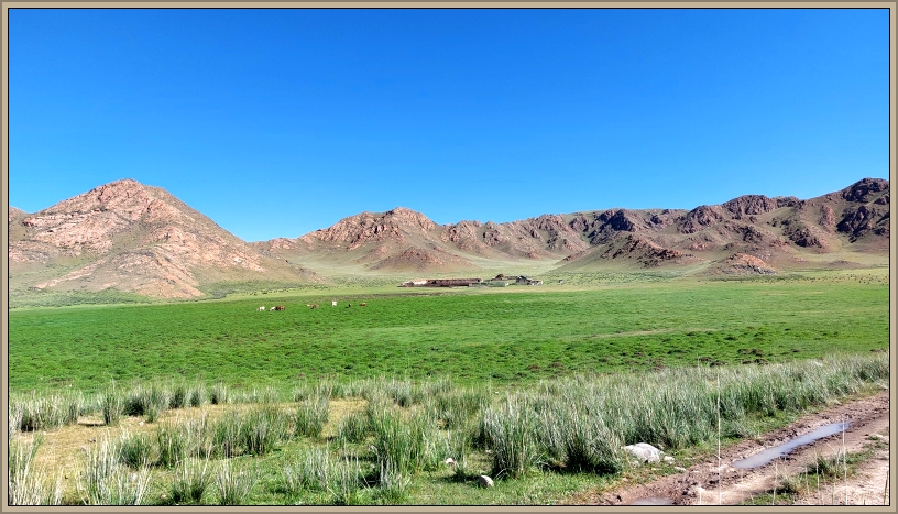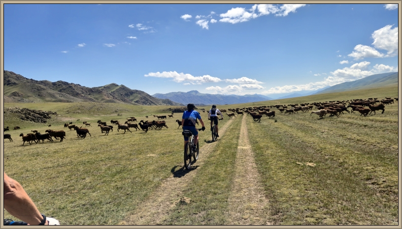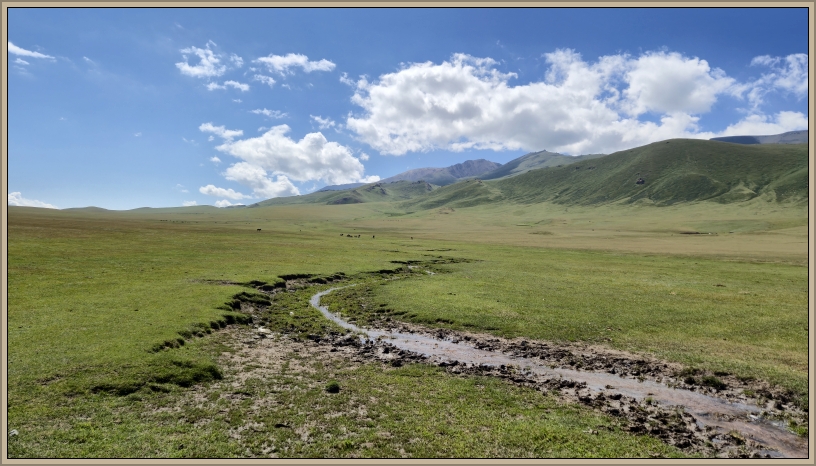Endlos scheint der Weg, gesäumt von Schaf-, Pferde- und Kuhherden. Ab und zu reitet ein Hirte an uns vorbei, hebt grüßend die Hand und setzt seinen Weg fort. Wir queren einen Bach und beobachten, wie Bolot mit dem Bus souverän die Furt durchpflügt – beeindruckend, was das Fahrzeug aushält. Kein Wunder, dass er abends immer die Aufhängung, den Motor und die Reifen kontrolliert.