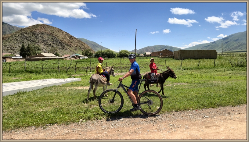Nach einer kurzen Bananenpause erreichen wir einen Fluss, den wir überqueren, und sehen in der Ferne schon das Dorf Tuura-Suu. Doch der Weg führt uns zunächst in einem großen Bogen auf eine Anhöhe, bevor wir in das Dorf hinabfahren. Dort begrüßen uns Kinder lachend vom Rücken eines Esels.