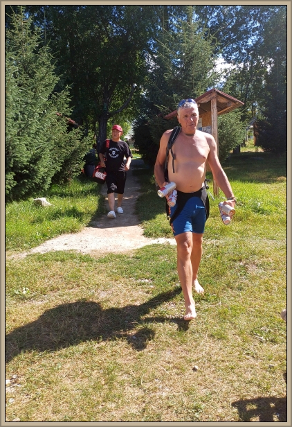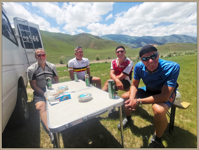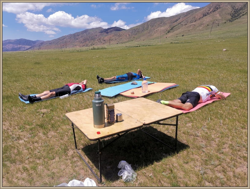 Ein weiterer Anstieg bringt uns auf 2.370 Meter. Hier schlagen wir unser Picknicklager auf – mit Tischen, Jogamatten und sogar einem Cognac, den Martin organisiert hat. Natürlich wird verkostet – mit Ausnahme von Bolot, denn in Kirgistan gilt 0,0 Promille. In der warmen Sonne ins Gras zu sinken, fühlt sich wie pure Erholung an, doch es warten noch 37 Kilometer auf uns.